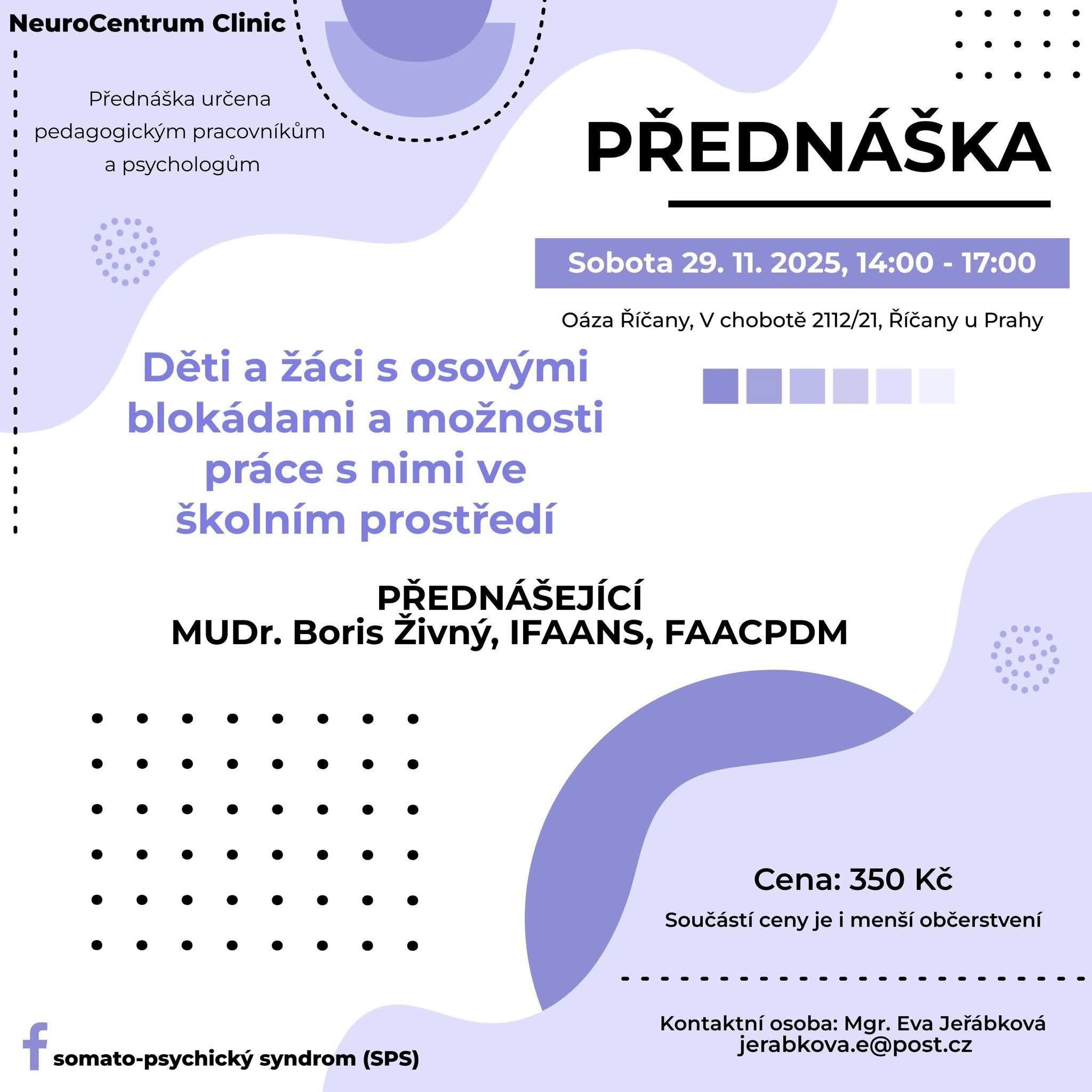 Odborná přednáška o somatopsychickém syndromu (SPS) – tématu, které propojuje tělesné a psychické potíže dětí a může pomoci lépe porozumět žákům s různými projevy chování či obtížemi při učení, se uskuteční 29. listopadu v Říčanech u Prahy.