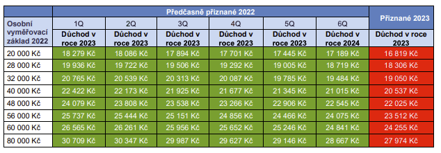 Pan Kříž bude nárok na důchod v únoru 2023, v té době bude doba jeho pojištění 46 let. Jeho osobní vyměřovací základ činí 28 tis. Kč. Pokud požádá ještě letos o předčasný důchod, pak jeho penze v roce 2023 dosáhne 19 936 Kč. Jestliže o řádný důchod zažádá až k únoru 2023, pak mu bude vyplácena penze ve výši 18 306 Kč, tedy o 1630 korun méně.