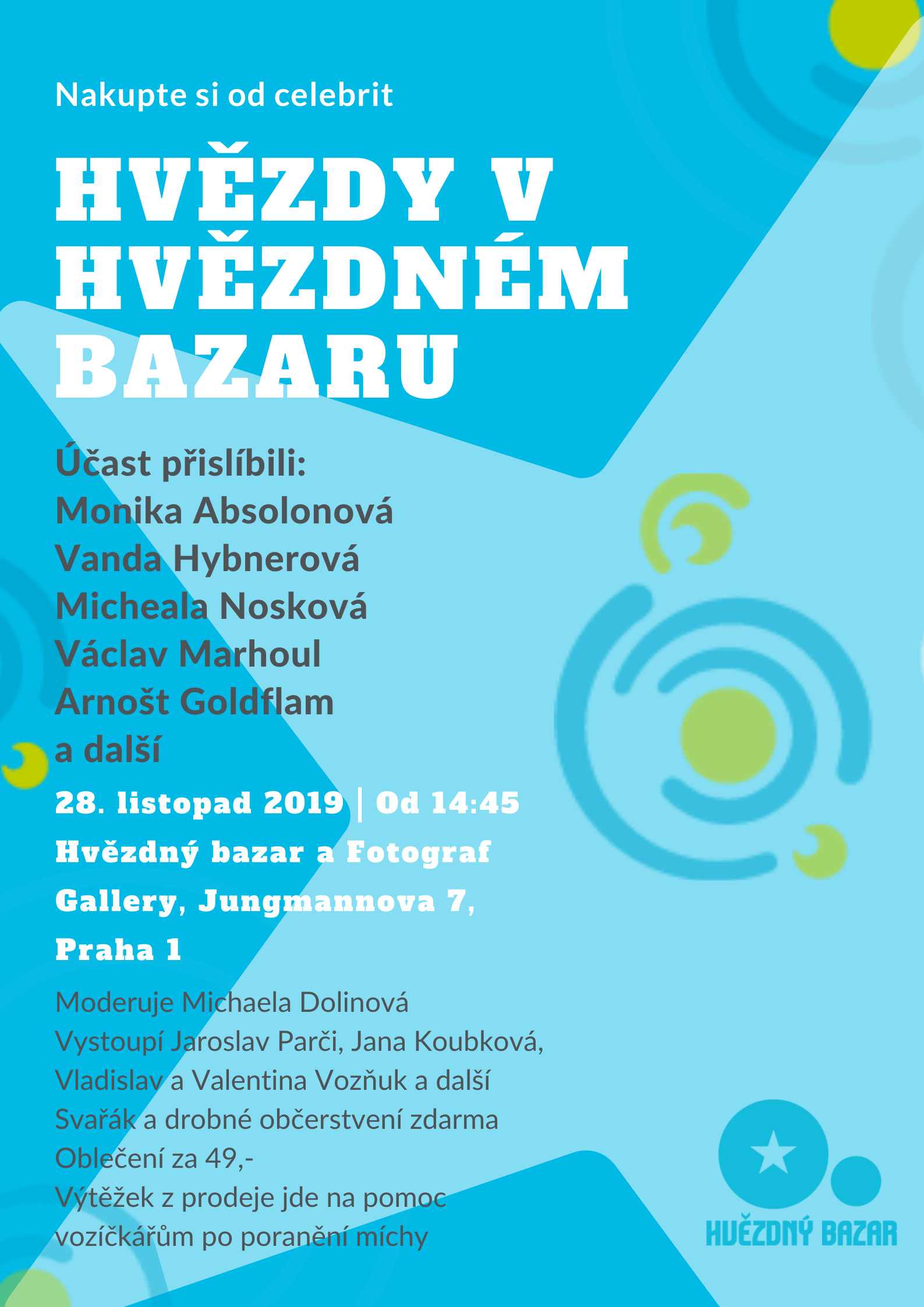 Monika Absolonová, Václav Marhoul, Arnošt Goldflam, Míša Nosková, Vanda Hybnerová a další zastoupí ve čtvrtek 28. listopadu v charitativním Hvězdném bazaru v Jungmannově 7 na Praze 1 vozíčkáře po úrazu míchy, kteří v obchodě běžně pracují.