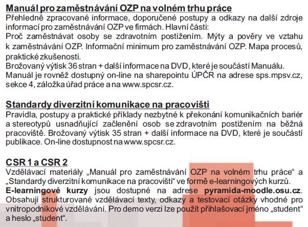 Stručné a názorné informační a vzdělávací produkty ve formě tištěné brožury obsahující DVD s elektronickou verzí, dostupné rovněž v on-line verzi na www.spcsr.cz a v e-learningové aplikaci pro vnitrofiremní vzdělávání, vydalo Centrum vizualizace a interaktivity vzdělávání s.r.o., Ostrava.