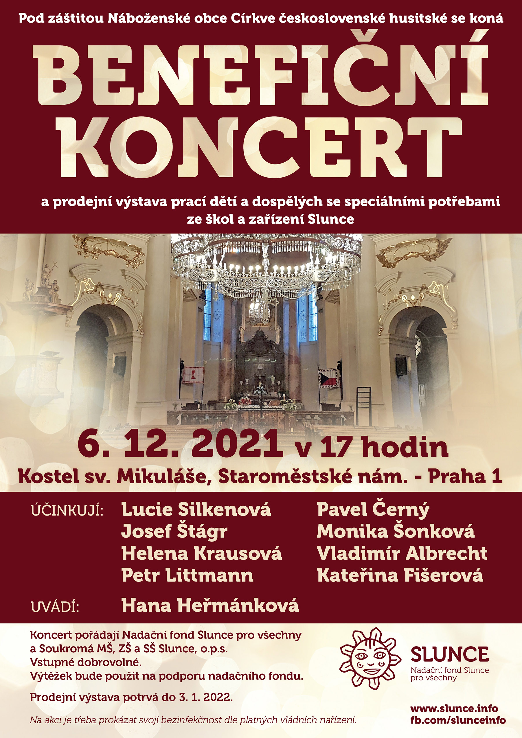Tradiční Benefiční koncert pro Slunce v kostele sv. Mikuláše se uskuteční v pondělí 6. prosince od 17 hodin. Součástí bude i vernisáž výstavy výrobků ze Slunce, na kterých se podíleli lidé se speciálními potřebami.