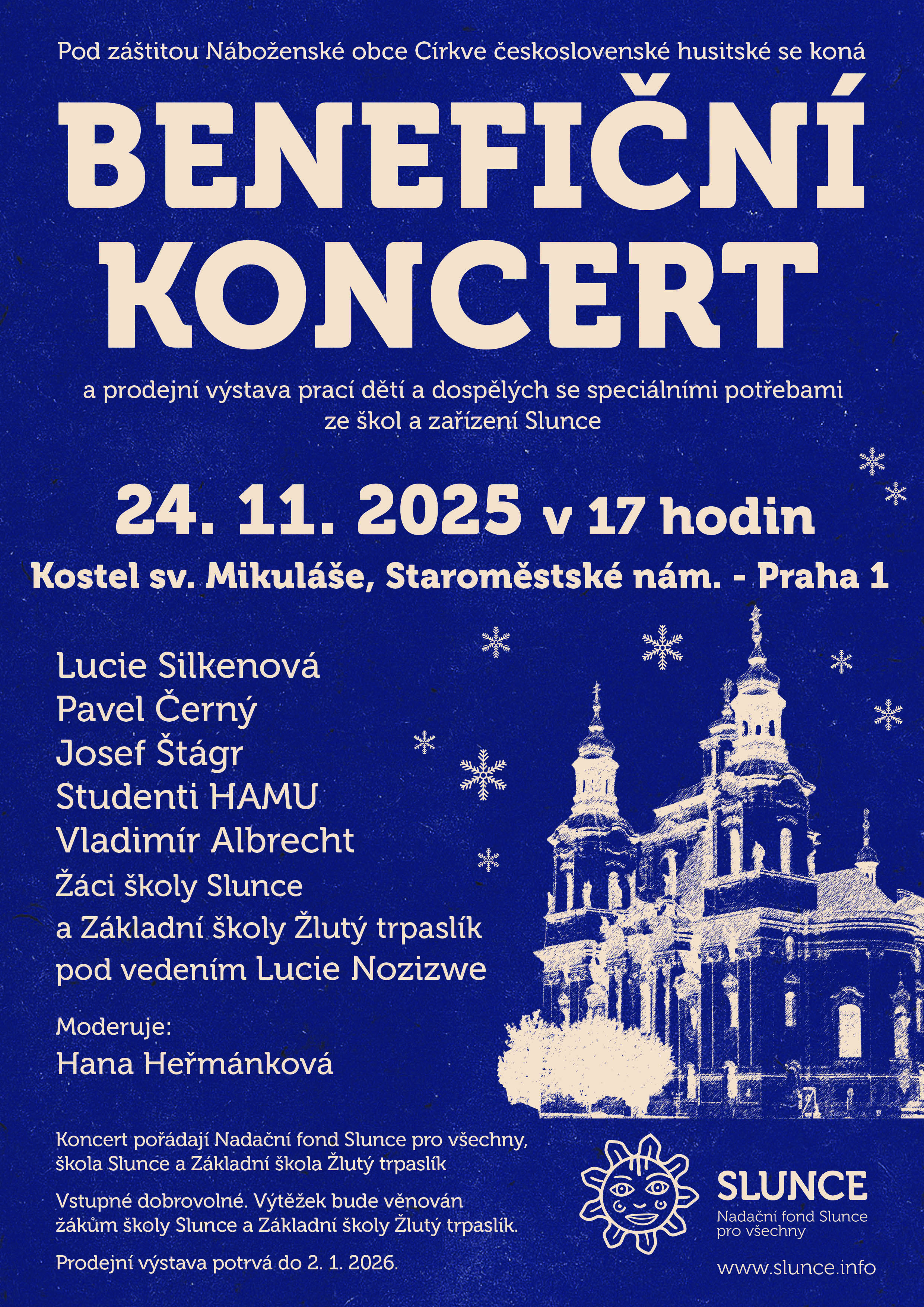 Nadační fond Slunce zve na benefiční koncert spojený s prodejní výstavou prací dětí i dospělých se speciálními potřebami. Akce se uskuteční 24. listopadu 2025 od 17 hodin v kostele sv. Mikuláše na Staroměstském náměstí v Praze.