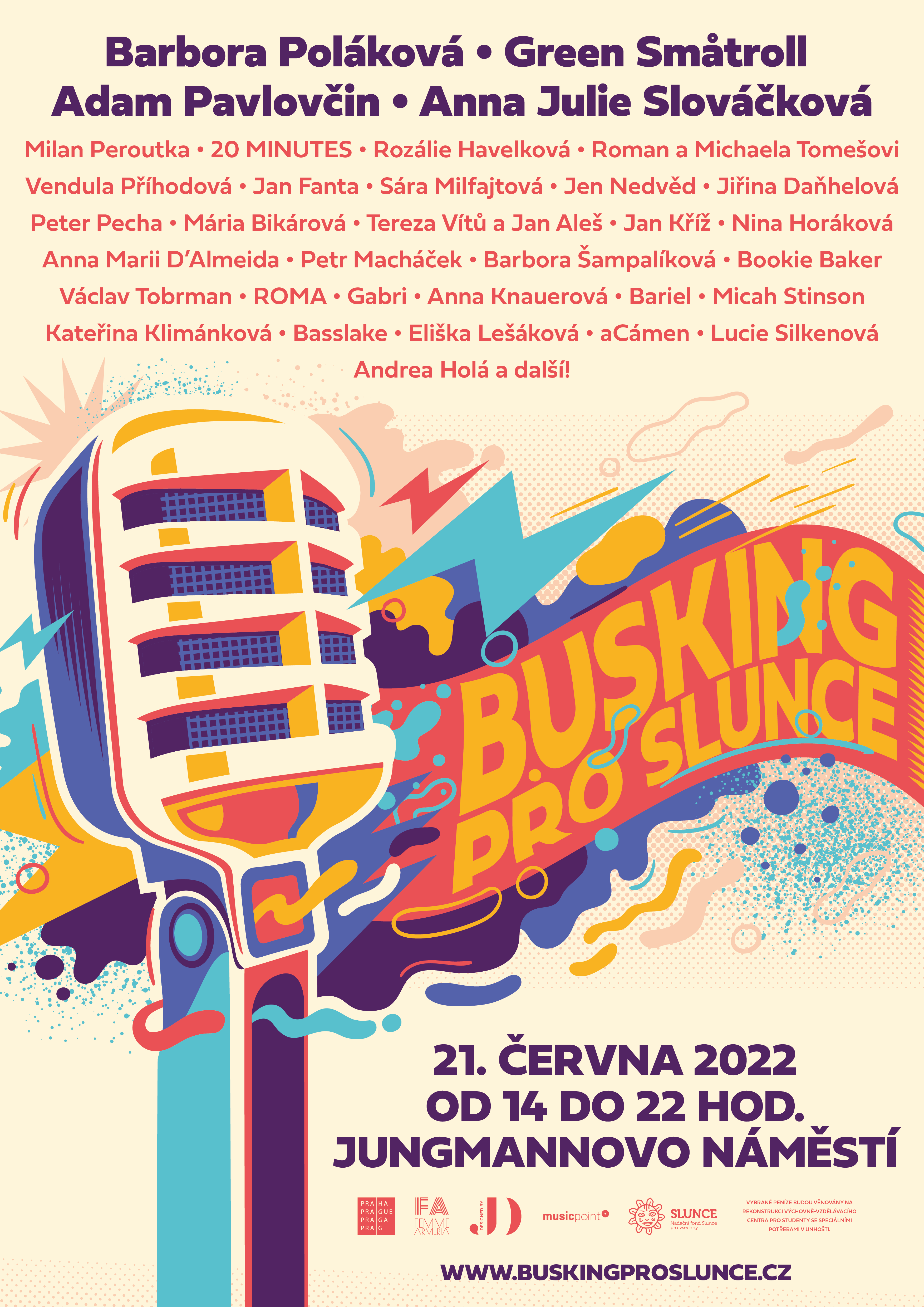 Zveme Vás na V. ročník charitativního Buskingu pro Slunce, oslavy pouličního umění spojené s podporou dětí a dospělých s hendikepy. Stavte se v úterý 21. června mezi 14 a 22 hodinou na pražském Jungmannově náměstí na koncertě, který bude nabitý energií a dobrou náladou.