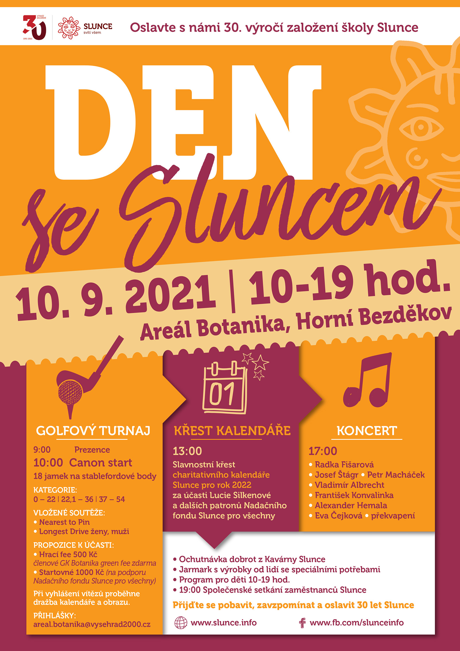 Oslavte s námi 30. výroční založení Slunce, které vzdělává a podporuje lidi s hendikepy. Den se Sluncem se koná v krásném prostředí golfového areálu Botanika v Horním Bezděkově.