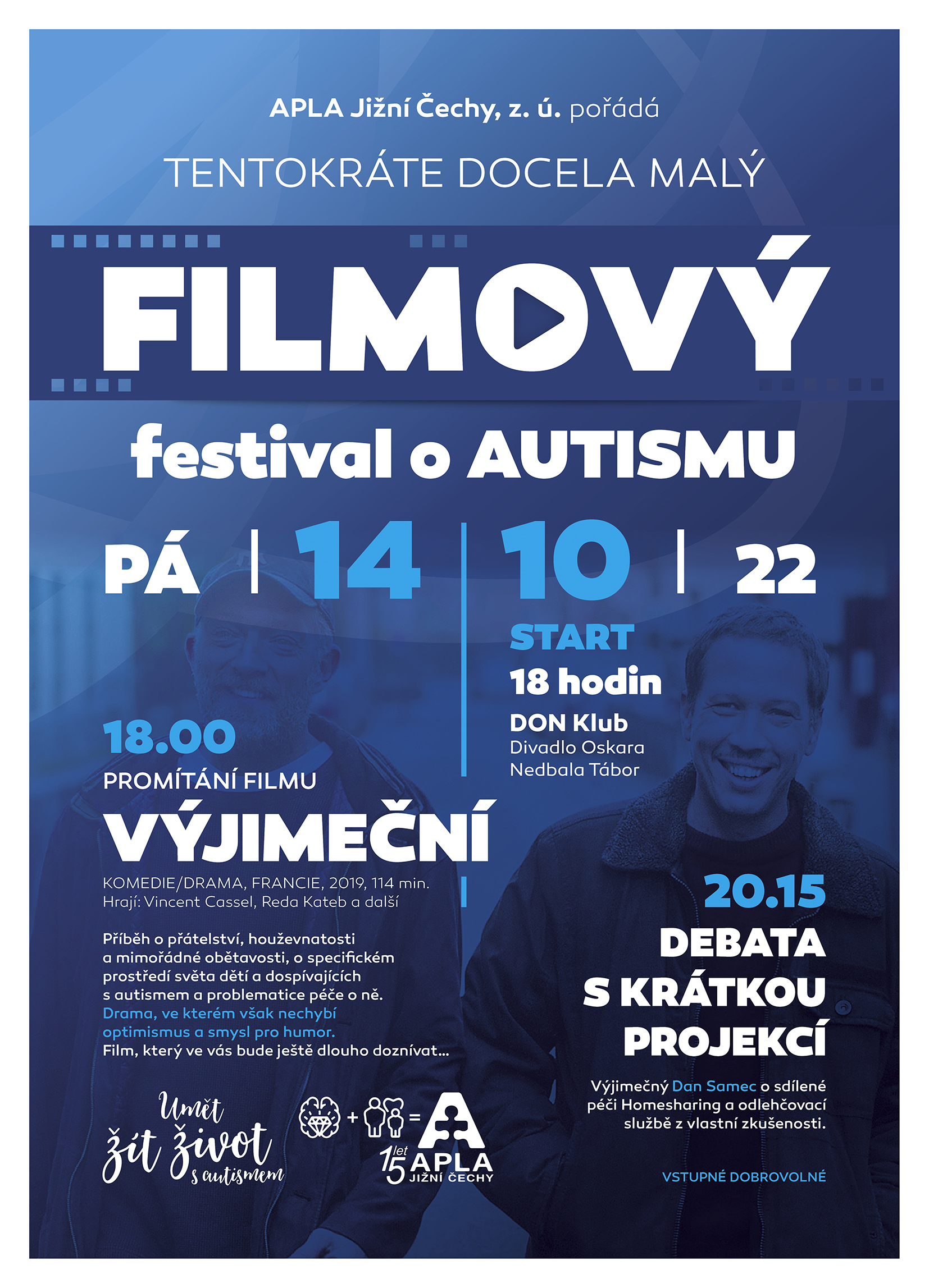 Letošní rok je narozeninový - je nám 15 let. Nadělujeme si k oslavám filmový večer, na který vás srdečně zveme! "Výjimeční" - film, který musíte vidět a poté krátká debata s Danem Samcem, který nám popovídá o svých zkušenostech se službou Homesharing a Odlehčovací službou v APLA JČ. Vše v příjemných prostorách DON Club (Divadlo Oskara Nedbala v Táboře, Divadelní 218, 390 01 Tábor) a DON Kavárny. Těšíme se na vás.