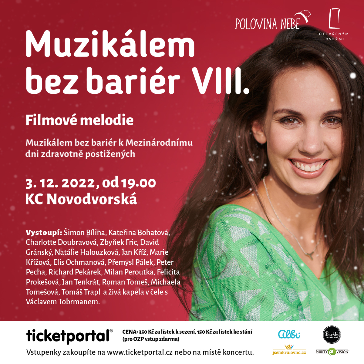 Osmý ročník Muzikálem bezbariér VIII., který pořádá Organizace POLOVINA NEBE, o.p.s. Každoroční benefiční koncert, jehož patronkou je herečka a zpěvačka Michaela Tomešová. Koncert je pořádán k mezinárodnímu dni zdravotně postižených 3.12. 2022 od 19:00.  Výtěžek z prodaných lístků je každý rok poukázán ve prospěch osob se zdravotním postižením nebo osob v tíživé životní situaci.Vstup pro OZP ZDARMA