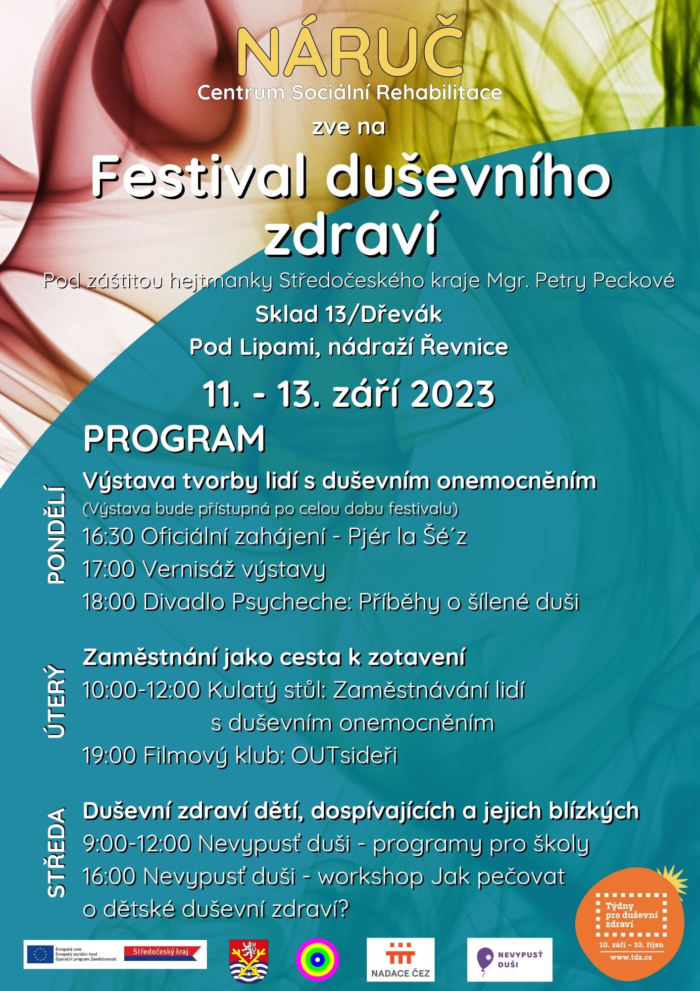 Nabízíme unikátní třídenní program vedený odborníky z praxe, např. psychology z organizace Nevypusť duši, během kterého můžete nahlédnout do života lidí s duševními obtížemi a objevit spoustu věcí i sami o sobě. Bude přížitost setkat se i lidmi s vlastní zkušeností s duševním onemocněním, zároveň i s týmem sociálních pracovníků z komunitního týmu sociální rehabilitace na Praze - západ. Po celé 3 dny festivalu bude otevřená prodejní výstava, celým prostorem vás budou provázet postavy vyprávějící své příběhy, nechte se překvapit. Občerstvení zajistí řevnický "Psychovar". Těšíme se na setkání.