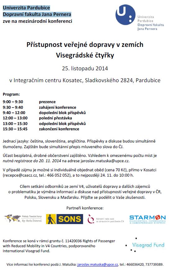 Datum: Úterý, 25. Listopad 2014 - 9:00 - 15:45Stručný popis: Mezinárodní konference v Integračním centru Kosatec v Pardubicích. Podrobný popis: Pořadatel: Univerzita Pardubice, Dopravní fakulta Jana Pernera
