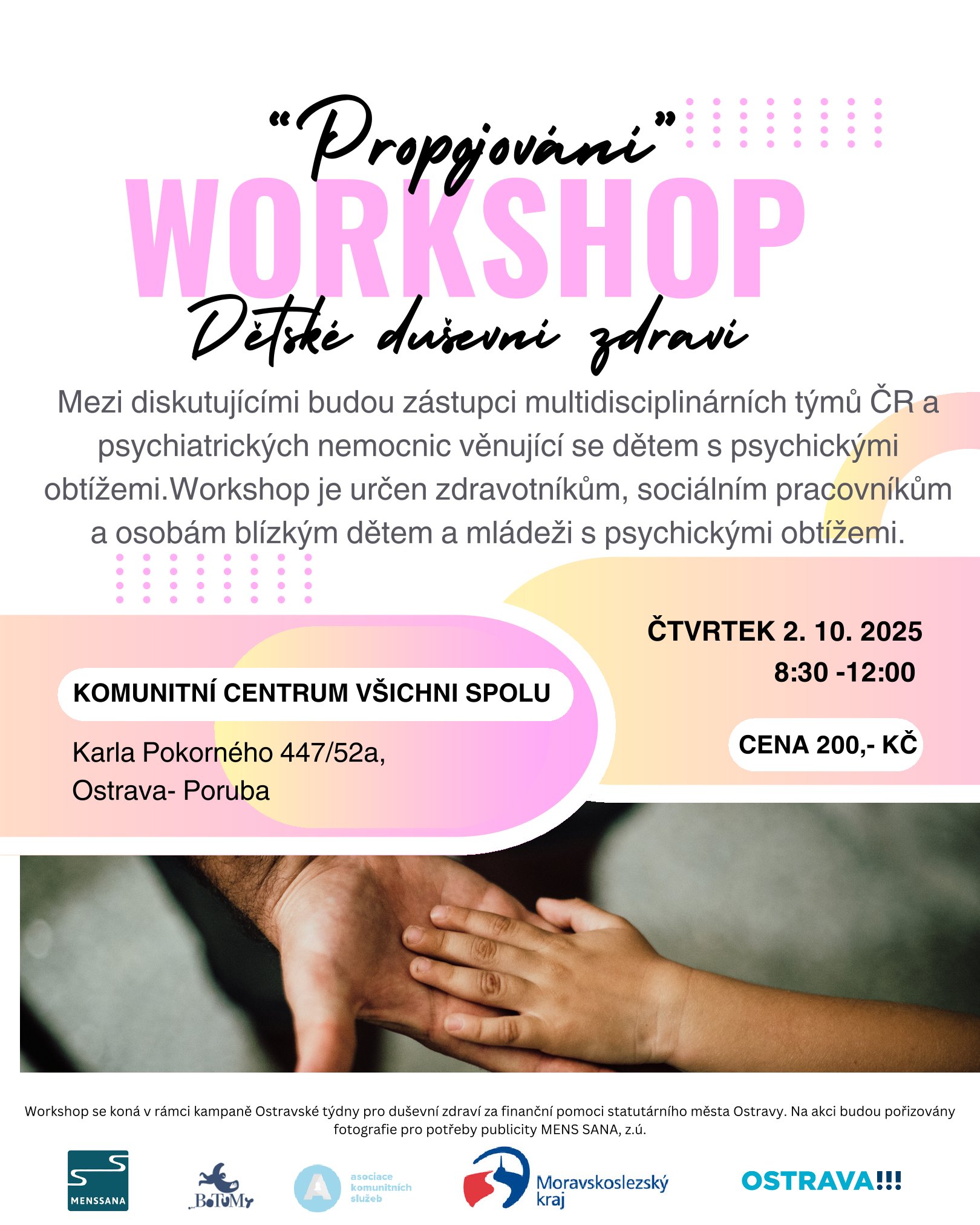 Workshop má již 12 letou tradici. Pravidelně se aktivně zapojují zdravotníci, psychiatři, psychologové a sociální pracovníci, kteří společně sdílejí své zkušenosti z oblasti duševního zdraví, tentokrát na téma: dětské duševní zdraví. Na workshopu bude prezentovat zkušenosti s dětmi a mládeži organizace Práh jižní Morava, z.ú., PaedDr. Blanka Veškrnová. Pozváni jsou zástupci psychiatrických nemocnic a Multidisciplinárních týmů MSK. Akce se koná u příležitosti kampaně TÝDNY PRO DUŠEVNÍ ZDRAVÍ. Akci podpořilo Statutární město Ostrava.