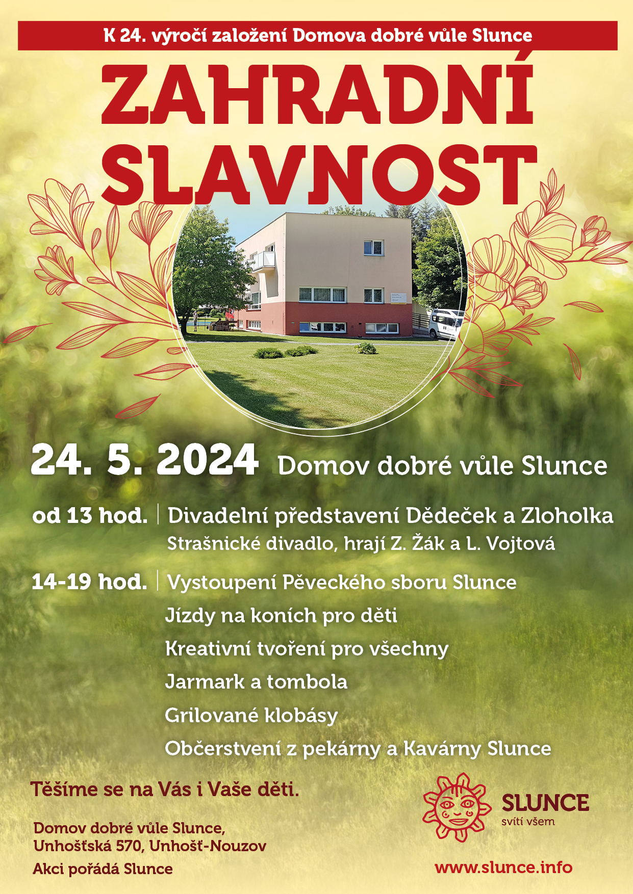 Přijďte s námi oslavit založení Domova dobré vůle Slunce v Nouzově. Na programu bude divadelní představení pro děti a odpolední program pro dospělé.